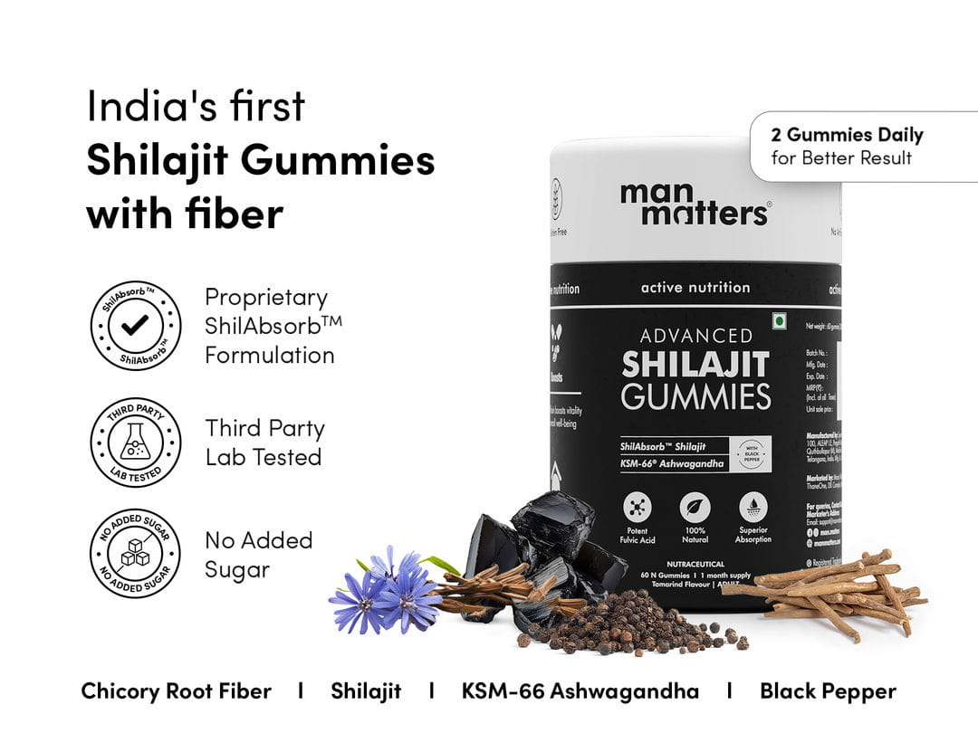 Shilajit (Asphaltum punjabianum) Resin, KSM-66 Ashwagandha (Withania Somnifera) Extract, Ginger (Zingiber officinale) Extract, Black Musli (Curculigo orchioides) Extract, Gokshura (Tribulus terrestris) Extract, Kaunch Extract, Piper nigrum (black pepper) Extract, Akarkara (Anacyclus pyrethrum) extract.